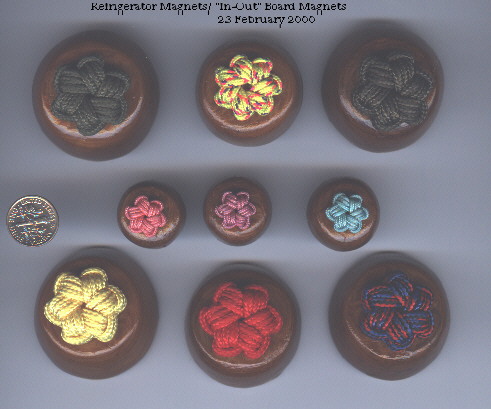 At this point, one little project to make is the "refrigerator/"in-out" board magnets"...I tye the bottom cords off and melt the ends and then they are glued into the wooden plug for the magnets.